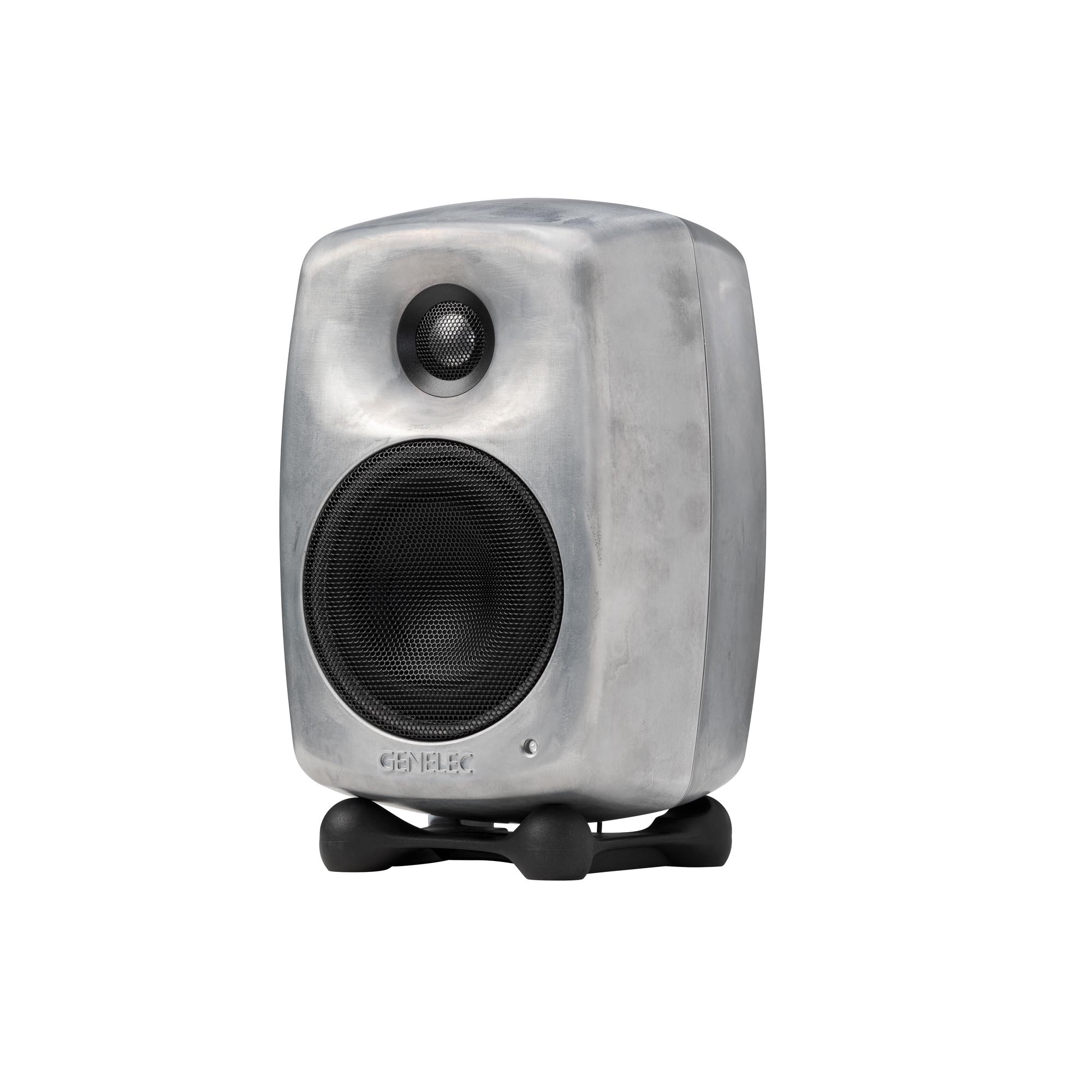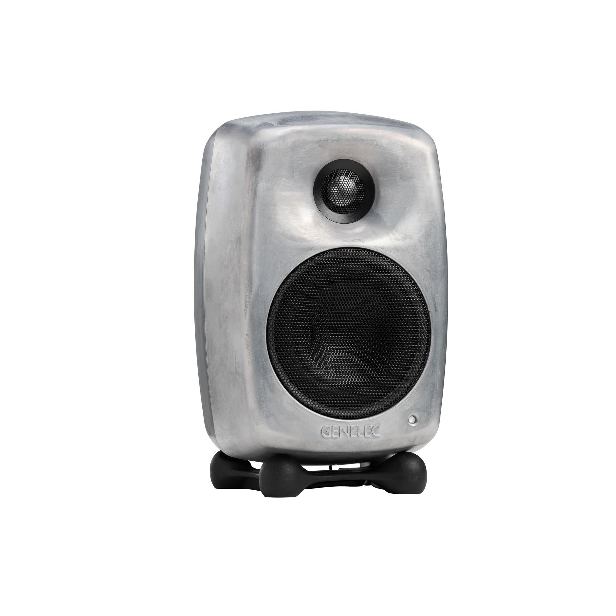 To solve these very common problems Genelec developed an efficient and very practical solution. We designed a loudspeaker stand called Iso-Pod™ - Isolation Positioner/Decoupler that is attached to the aluminium enclosure. It has four shallow feet and it is made from special lossy rubber-like material. It is firmly attached to the enclosure so that it can be slid along the curved bottom or side surface to allow for a ±15° tilt of the loudspeaker.